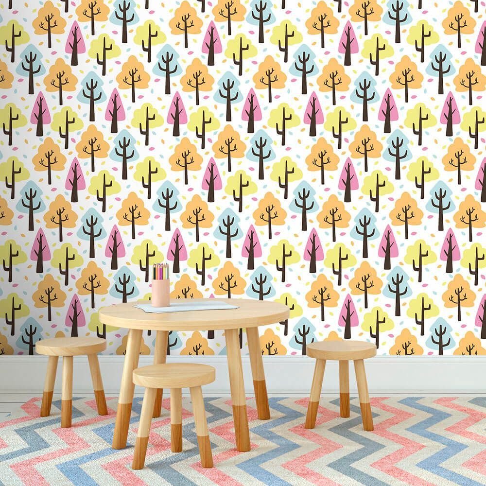 O Papel de Parede Árvores Fofas é fabricado em adesivo vinil fosco 3M, autocolante e com excelente qualidade de impressão. Não precisando de cola.