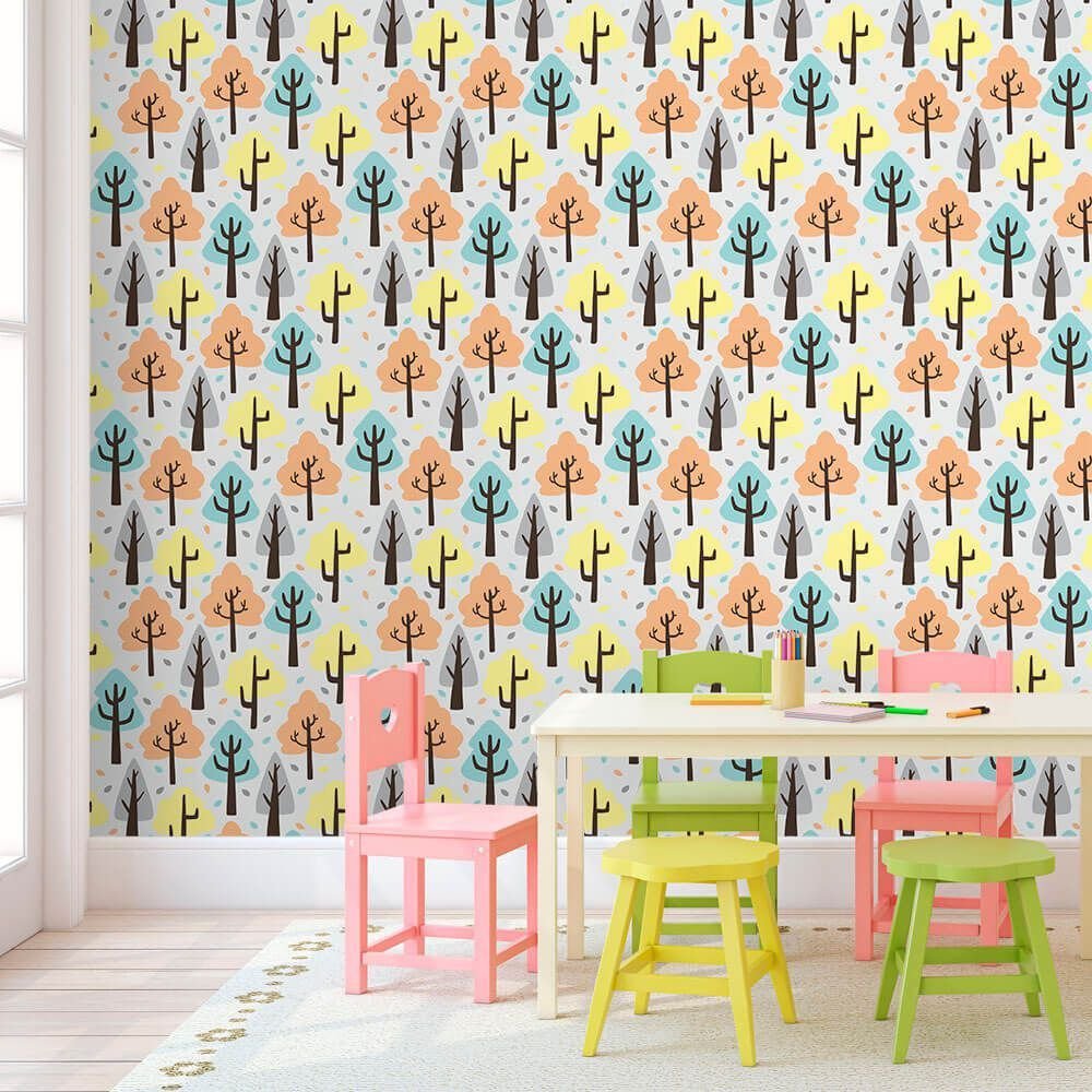 O Papel de Parede Árvores Fofas Kids é fabricado em adesivo vinil fosco 3M, autocolante e com excelente qualidade de impressão. Não precisando de cola.