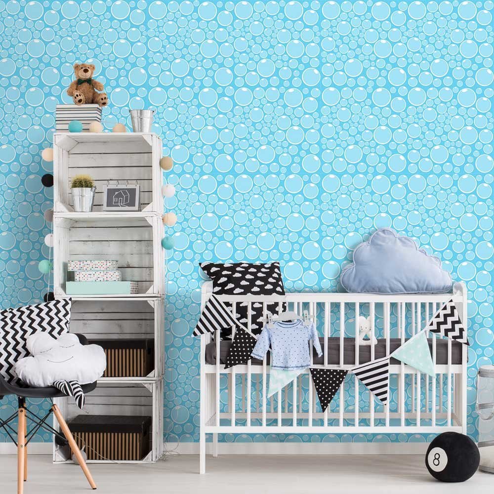 O Papel de Parede Bolhas de Sabão é fabricado em adesivo vinil fosco 3M, autocolante e com excelente qualidade de impressão. Não precisando de cola.