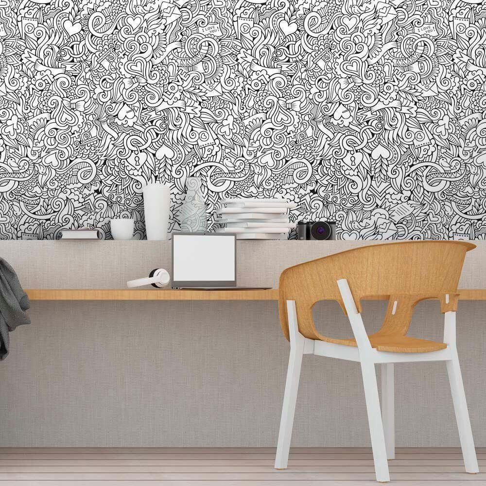 O Papel de Parede Doodle é fabricado em adesivo vinil fosco 3M, autocolante e com excelente qualidade de impressão. Não precisando de cola.