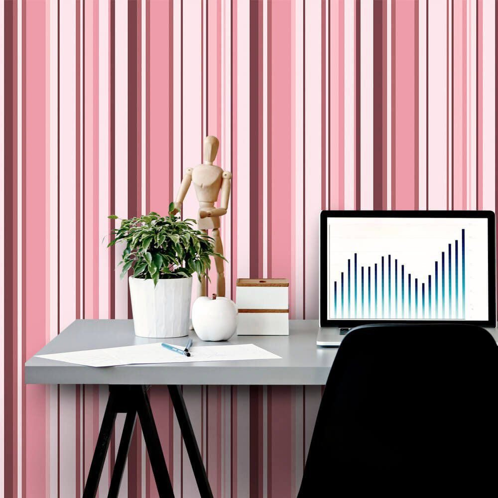 O Papel de Parede Listras Thin Rose é fabricado em adesivo vinil fosco 3M, autocolante e com excelente qualidade de impressão. Não precisando de cola.