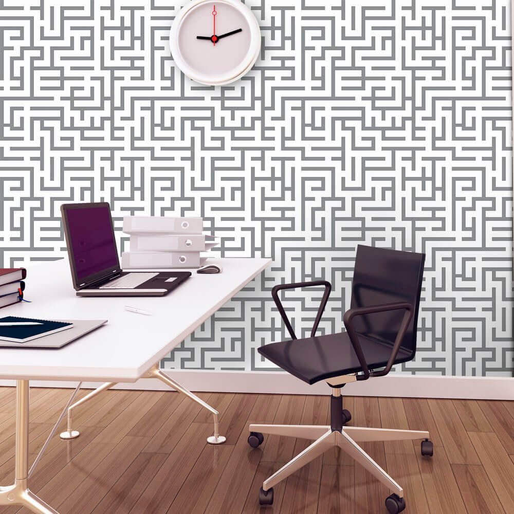 O Papel de Parede Maze Gray é fabricado em adesivo vinil fosco 3M, autocolante e com excelente qualidade de impressão. Não precisando de cola.