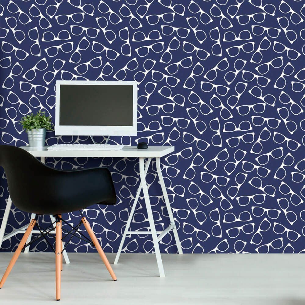 O Papel de Parede Óculos Geek Navy é fabricado em adesivo vinil fosco 3M, autocolante e com excelente qualidade de impressão. Não precisando de cola.