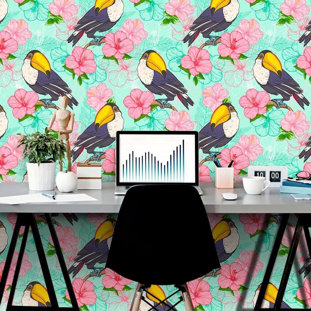 O Papel de Parede Tucano Flowers é fabricado em adesivo vinil fosco 3M, autocolante e com excelente qualidade de impressão. Não precisando de cola.