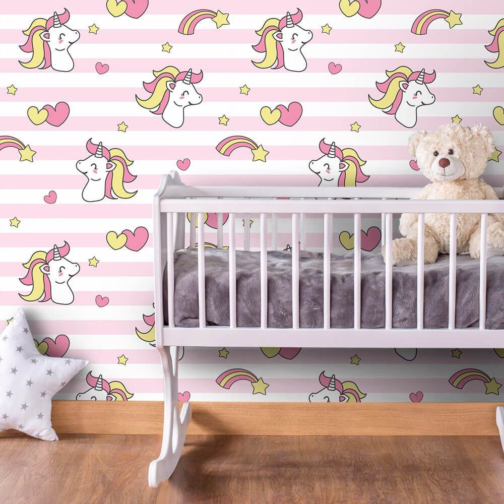 O Papel de Parede Unicórnio Candy é fabricado em adesivo vinil fosco 3M, autocolante e com excelente qualidade de impressão. Não precisando de cola.