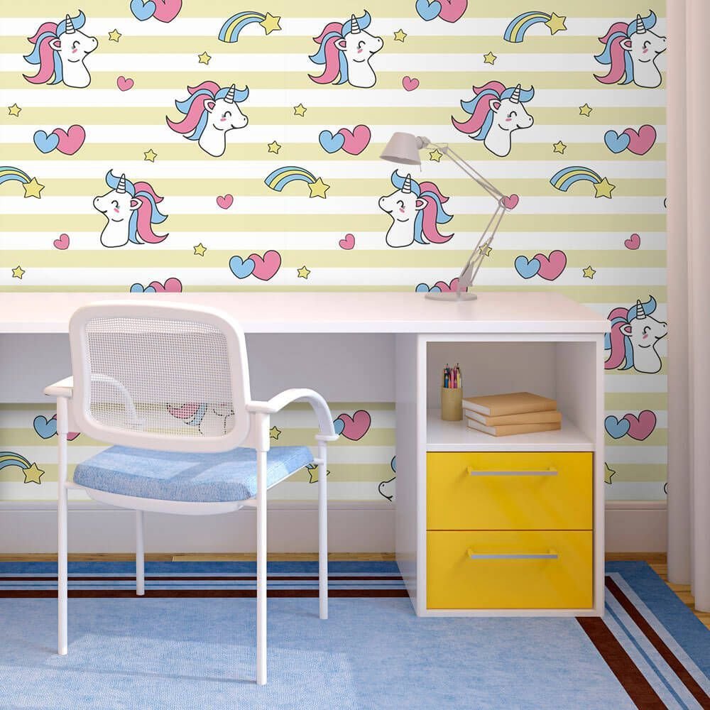 O Papel de Parede Unicórnio Candy Clean é fabricado em adesivo vinil fosco 3M, autocolante e com excelente qualidade de impressão. Não precisando de cola.