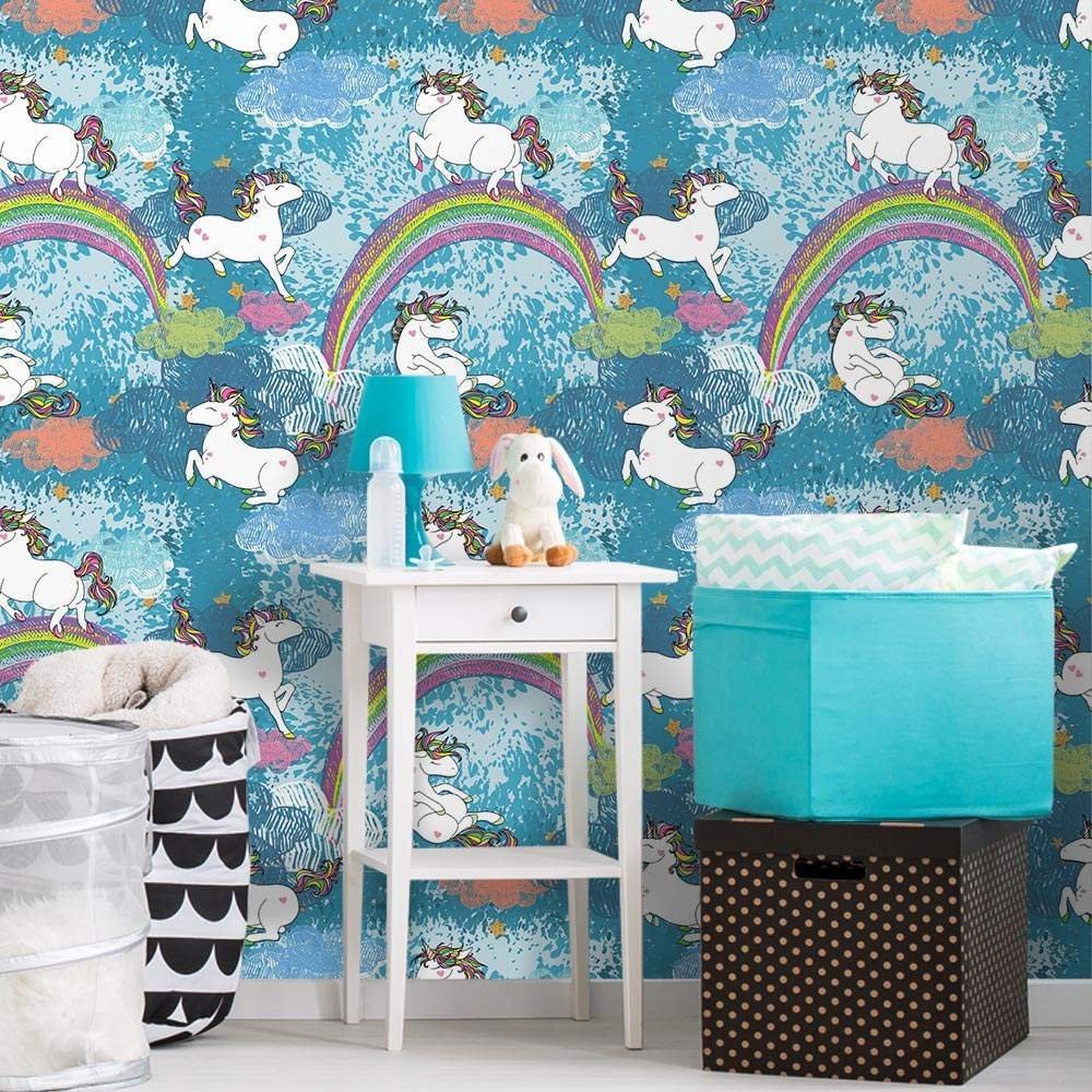 O Papel de Parede Unicornios é fabricado em adesivo vinil fosco 3M, autocolante e com excelente qualidade de impressão. Não precisando de cola.