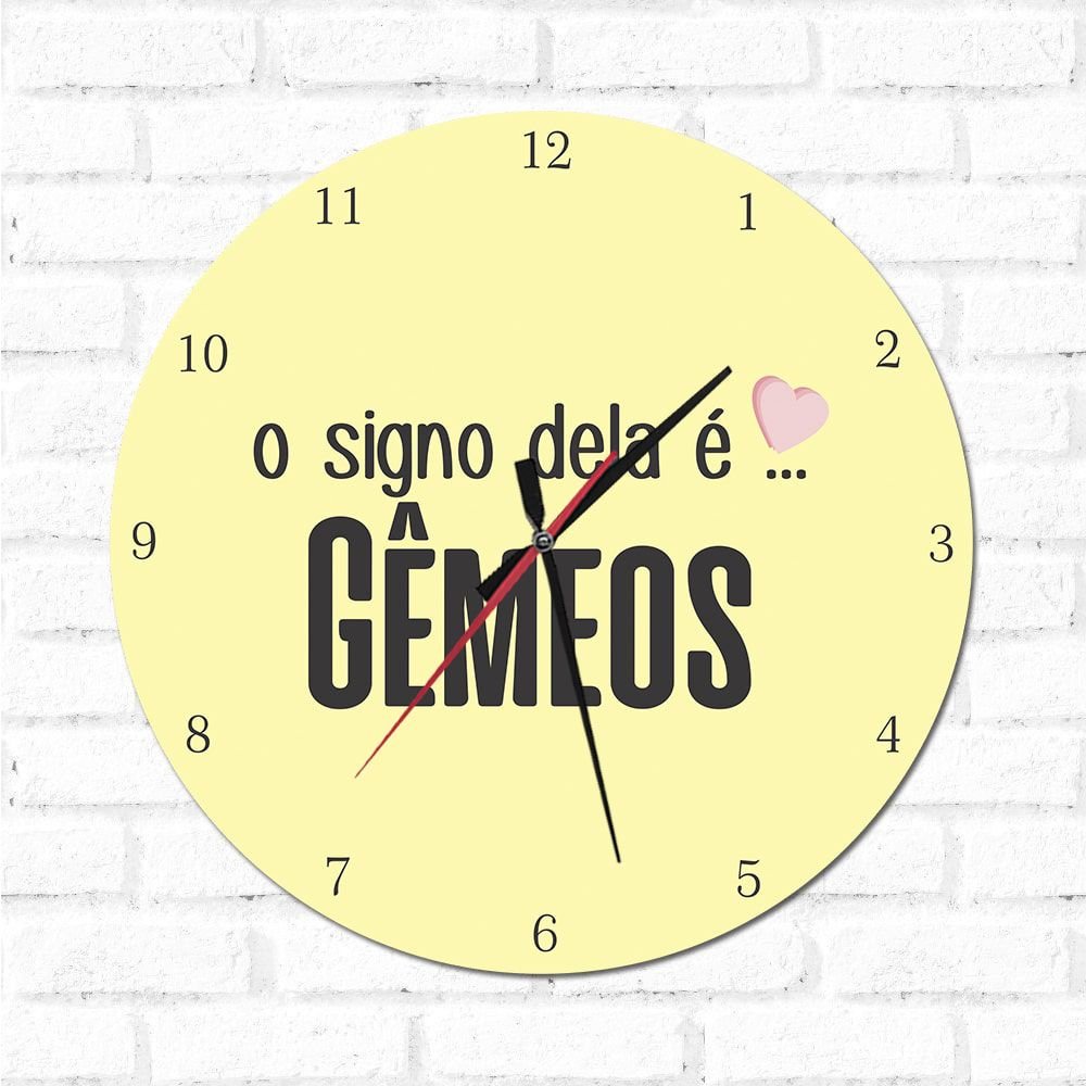 O Relógio Decorativo O Signo dela é Gêmeos é uma ótima opção para decorar sua casa, além de ser um item funcional, é também um item decorativo. E pode ser colocado em qualquer ambiente.